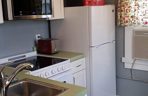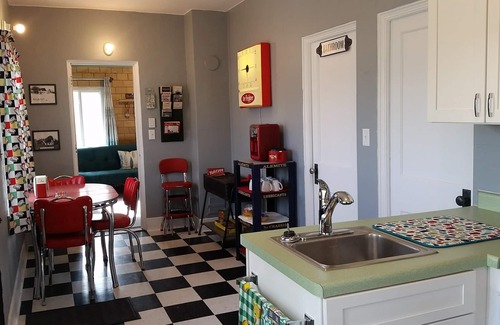 We’ve kept as much of the original building’s elements as possible while restoring it with a mid-century vibe and local history. There are many vintage items to help you immerse yourself in the '50s. The bay area has been converted into living/sleeping space including TV & seating area as well as queen-sized bed & dresser. The futon folds down to sleep one person. The back room has 2 twin beds and dresser as well. It leads to a fenced backyard with shaded patio and gas grill. The kitchenette features refrigerator, stove top, oven & microwave. Cupboards are stocked with dishware/utensils/cookware. The dining area has a formica table and seats 3 or 4. The bathroom has a tub/shower unit with toiletries. (Not ADA compliant). The utility room offers a washer and dryer. Plenty of parking available to side and front of building.