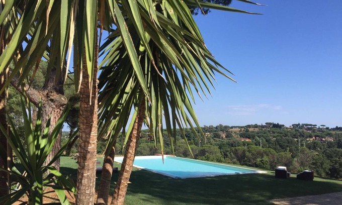 Upstairs we find a living room with fireplace, a large kitchen and two large double bedrooms one with ensuite bathroom and another complete with shower. The house is finely furnished with fine furniture and finishes with great attention to detail. It is bright thanks to large windows overlooking the park and is equipped with all comforts: air conditioning and smart TV in all rooms, free wi-fi and towels and bed linen included in the price. The villa is located in an optimal and strategic position between the countryside and the city: we are in fact inside an archaeological area in the Parco di Veio area. The house is well connected by public transport and is only 15/20 minutes from the center. There is also the possibility of a shuttle service on request. Possibility to have lunch / dinner in the open air and take advantage of the barbecue for excellent barbecues. Around the pool there are also lounges for relaxing and sunbathing.