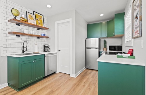Welcome to a kitchen where timeless charm meets modern sophistication! This kitchen is the perfect space to prepare breakfast, lunch and dinner during your getaway. You will have access to all new stainless steel appliances including an electric stove & range, refrigerator, dishwasher, microwave, and an enhanced coffee bar. You will not need to go anywhere else!