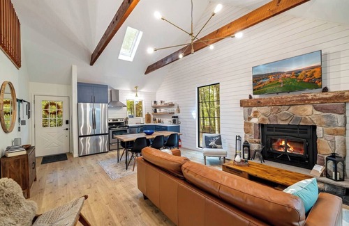 An open plan living/dining/kitchen are perfect for entertaining and spending time together. 65" Smart TV on a movable mount, wood-burning fireplace, vintage record player, 6-person dining table, microwave, full stove/oven, coffee maker, basic kitchen utensils and cookware. High speed internet.