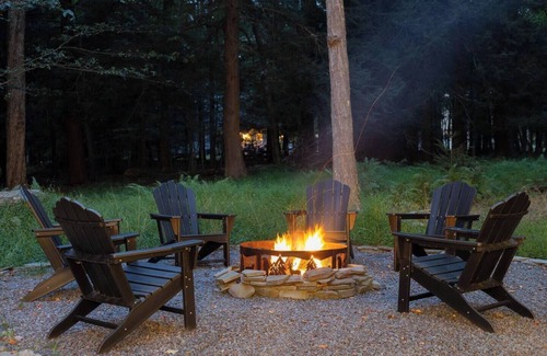 This is where this cabin truly shines! You won’t find anything quite like it. The rear deck is spacious, private, and overlooks a truly beautiful yard with woods, ferns, a small stream, a firepit, a wood-fired hot tub and more. You won’t have to go far to experience the scenic surroundings of the Poconos area.