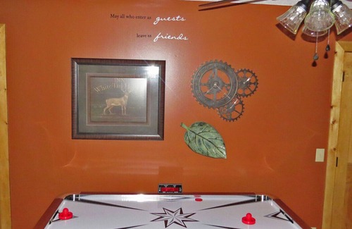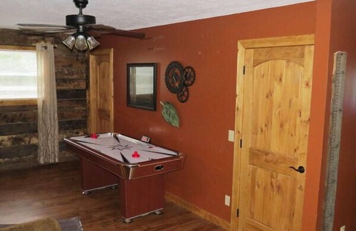 The Pine Ridge home is located on 4 private acres a few miles from our main resort, just minutes from the Garden of the Gods, the most visited site in the Shawnee National Forest. The home was completely gutted and remodeled in 2016 and features a hot tub on the covered porch. There is an air hockey table in the game area and of course, FREE WiFi and Dish TV with FREE movie channels. The kitchen is a large full size kitchen. The dining area table seats 6. There is a twin size day bed with trundle in the game room. We supply complimentary coffee, coffee filters, cream, sugar packets, salt, pepper, hand soap, dish soap, toilet paper, paper towels, firewood and camp chairs and of course, FREE WiFi.