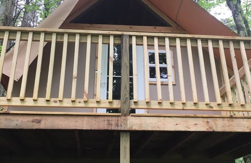 ***Please Read Entire Description Before Booking*** The Pine Treehouse Glamping Cabin is an off-grid cabin that overlooks beautiful Dragonfly Lake. It is located on a secluded and private 20 acres in the foothills of the Appalachian mountains. This cozy cabin has a queen bed and two twin beds in the loft. This Glamping site is perfect for families who like to camp in comfort without the hassle of camping. The Pine Treehouse Glamping Cabin is set up on a hill with a nice deck for relaxing or eating or just taking in a birds-eye view of Dragonfly Lake! This cozy nest lets you enjoy the sounds and views of nature but still have the comfort of home. This is a nature lovers paradise... enjoy watching ducks, geese, blue heron, egrets, hawks, varieties of turtles, large mouth bass, catfish, bluegill, deer and many more animals.