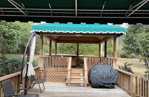This Colonial Style Home has countless amenities. Nestled on it's own, private 5-acre lake with a fishing pier and paddle boat for your pleasure. This property is surrounded by 150 acres of gorgeous Pine Trees. Take a stroll in the woods, enjoy a campfire by the lake. Rock on the rocking chairs on the front porch, sip a glass of wine and watch sunset light up the sky through the pines. Soak in the 6 person jacuzzi under the stars. Come make yourself at home and enjoy our slice of paradise.
