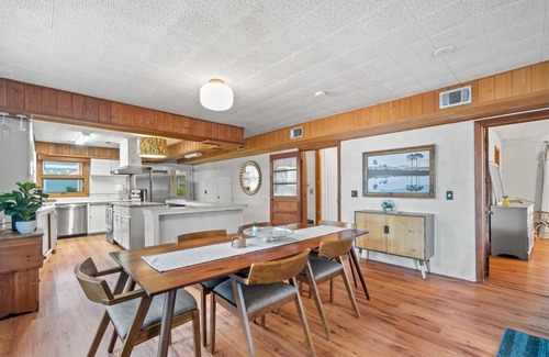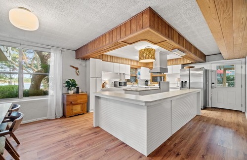 - Kitchen & Dining: Fully equipped kitchen featuring white cabinetry, stainless steel appliances, and a large island for meal prep. Dining area includes a hardwood table with seating for six.