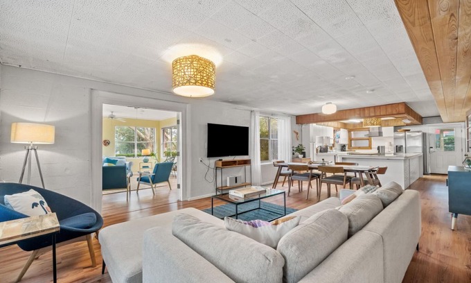 - Living Areas: Main living room with stylish Vintage Modern furnishings and a flat-screen TV, bonus den for additional lounging, and a spacious Sunroom with floor-to-ceiling windows, comfortable seating, and another flat-screen TV.