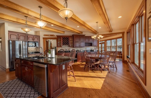 Sturdy 34' oak beams accented by a massive stone fireplace and rich leather tones greet you in the 2,000 sq foot great room! Have a quick refreshment at the welcome bar, tickle the keys of the baby-grand or pour yourself into one of the many lake-facing leather couches. The great room is a true gathering space for groups, small and large. There are multiple couches, card tables, a wet bar, a loft lounge with poker table and video center the extends the entire width of the structure in addition to a Juliet balcony off the Master. The space can easily accomodate 25+ people engaging in intimate conversation without feeling encroached.