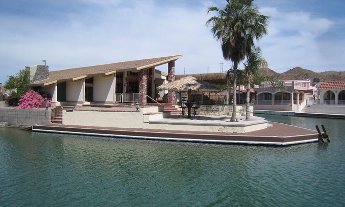 The house is located in a gated community where the houses are on canals that go out to the Colorado River. It is ideally located on the main canal that connects to the river. It is at a fork in the canals creating a large body of water in front of the house. This makes for easier maneuvering of boats. A very large patio and huge wrap around dock make for more enjoyable outdoor living. 5mph speed in the canals make for safe swimming at the house and safe mooring for vessels. The 120' dock is private and belongs to the house. There is 60' on one side and 40' on the other of usable space for mooring.