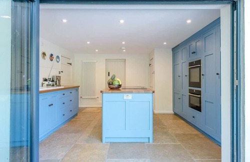 Beautifully designed and hand crafted, this fabulous kitchen offers guests all modern appliances for modern living. Bifold doors open the rear wall of the kitchen into the stunningly landscaped cottage garden.
