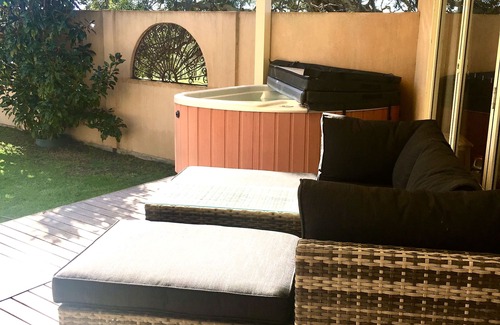 •Private covered deck with 2 person spa and BBQ.