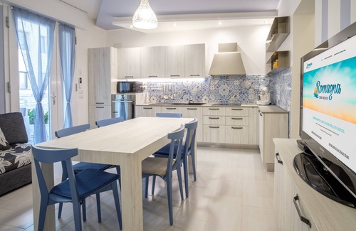 Apartment on the mezzanine floor with private entrance, in an elegant and totally renovated context, inside a fenced court. It overlooks the beach and the main square of the village. It consists of 3 double bedrooms, one with a bunk bed, kitchen with double sofa bed, 3 private bathrooms with shower, table and chairs outside, living room with outdoor TV. It is tastefully furnished according to the latest trends in furniture. The kitchen recalls the marine style with the Azulejos tile covering. It is equipped with all the most modern appliances (induction hob, microwave, dishwasher, washing machine, etc ....). The portico with sea view is ideal for al fresco dining, and the living room lends itself to enjoy the warm summer evenings. Ideal for families with children, or for anyone who wants to enjoy the perfect position on the beach, and to participate in the evenings organized by the San Mauro Mare Village, in the square or on the seafront.