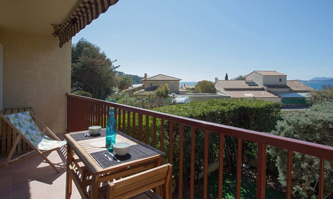 My home of 33m2 is close to the sea. A minute walk. You will appreciate my housing entirely done again for nine, for its situation, its sight on the sea, its terrace, and a parking in the residence. With complete equipment (Air conditioning, WIFI, oven, microwave, washing machine etc.). It also has a small room with a 140 bed and a sofa bed. A cellar available and a bike room. Visit the islands of Hyères (Porquerolles, Port-Cros) from Hyères