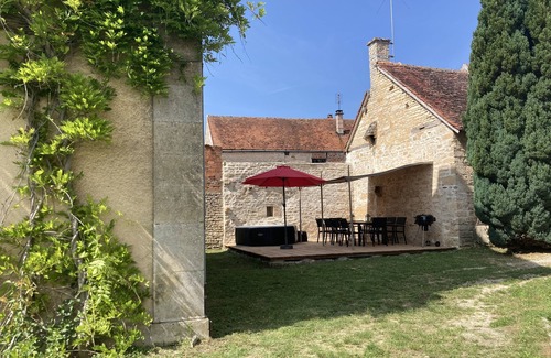 Sunny, south facing Presbytery, nestled in the heart of the village with spacious garden to the front and just a stones throw from UNESCO Fontenay Abbey. Alfresco eating space with barbecue, sun loungers, brasero and jacuzzi.