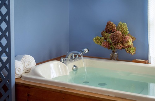 The Presidential Suite is located in the yellow farm house on the second floor south side with views of the gardens and the big red timber frame barn and The Lodge. King bed, large BainUltra air jetted whirlpool bathtub for 2, private bath with tub shower, electric fireplace, table for 2. Refrigerator, coffee maker, microwave, bathrobes. Common area living and dining room on first floor with piano. Breakfast served daily 7:30-10 am in The Lodge, your room or eat in our many outdoor dining spaces.