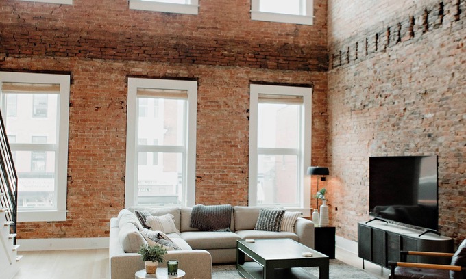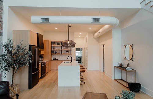 Three bedroom townhome located on the top two floors of a recently renovated historic building in downtown Chillicothe. The living room is a beautiful, two story space featuring windows that overlook one of the busiest areas of downtown Chillicothe. Modern decor paired with historic elements, help provide the perfect space for a relaxing and cozy feel while providing a high-end experience.