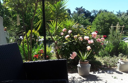 A 30m² shaded private terrace bordered by a pretty flower bed.