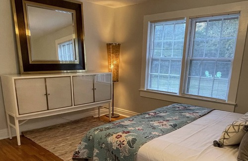Well designed double King primary suite home with a bonus room equipped with a Queen and a futon. Full private backyard, porch dining and/or lounging, string lights, full kitchen, laundry, and full bath. Did I mention the dining room that opens to the kitchen and living room? Open concept living, well updated and a walk to historic downtown Bennettsville. Main Street living at its best!