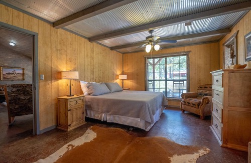 Built in 2008, the “Ranch House” has a relaxed, western vibe. Cowhide rugs, western and wildlife art, rustic wood finishes, and stained concrete floors set a laid-back tone. With over 1500 square feet of living area, the home is spacious, warm, and inviting, the perfect gathering place for family and friends. There’s a large, vaulted great room with seating for eight, a long dining table, and four barstools around a central kitchen island. Flanking the great room are two roomy bedroom suites, each with its own bath.
