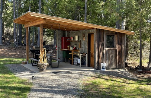 We welcome you to experience the natural scenery in the majestic mountains of Naples, Idaho. The spacious Teepee provides comforts of home with 1/2 bath, cozy California king bed, full size futon, keurig coffee to start your morning ,and sitting area while enjoying the nature surrounding you. Handcrafted tipi poles harvested from our property, the fire pit flaming against the perfect storytelling rock, and relaxing sounds of birds throughout the mountainside. Property includes your own shower house, and a covered kitchen with a bbq, mini fridge, blender, pans, dished and utensils. Pet friendly!