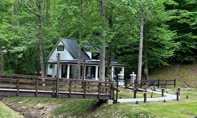 Park in our private pull thru parking area and walk over the beautiful lighted walking bridge that leads you to the cottage. We wanted to create a place for our guest to enjoy; relax & feel at home. A queen size downstairs bedroom; queen size upstairs loft bedroom; full size kitchen; dining area; full bath with walk in shower; TV/WIFI; wraparound covered porch; private outdoor shower against hillside; private hillside two person hot tub; indoor loft hammock; outdoor covered back porch dining area; outdoor hammock. Enjoy the large 12x12 outdoor hammock in the front yard area and build a fire in the large outdoor firepit area.