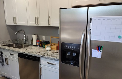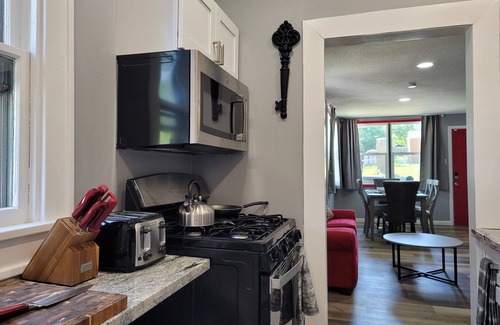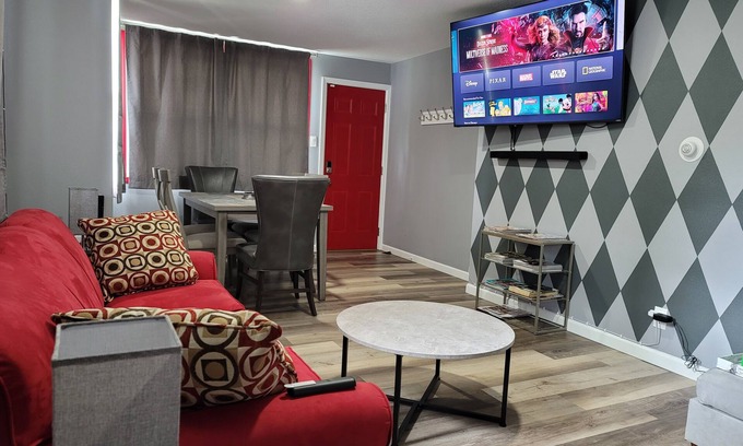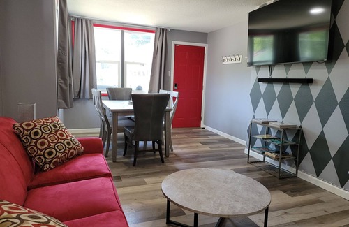 Drive downtown in 5 minutes or less. The Red Door is perfect for a small 3 person crew and can also fit up to 7 guests comfortably. Enjoy a complimentary coffee and tea station each morning, day and night if you please. Including a 65" flat-screen smart T.V. surround sound with HBO, Netflix, Disney Plus, and Amazon. Rainfall shower head with 9 settings, including a high pressure and water fall setting. Book today if your a crew of 2-7 or a whole family the Red door's has you covered.