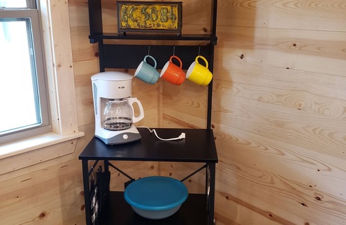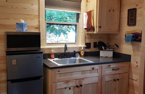 There is a bathroom with shower, sink, and toilet; kitchenette with fridge, sink, microwave, and coffeemaker; and outdoor deck with gas grill. It has a wall A/C heating unit.