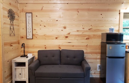 Our brand-new 14' x 24' cabin sleeps four people, with a full bed downstairs and full bed in the sleeping loft.