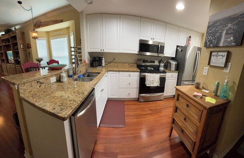 The luxurious master bedroom is furnished with a King-size bed, while the guest room offers a cozy Queen-size bed. Additionally, the bonus room features a twin-sized bed for added convenience. Both bathrooms boast granite countertops, with the master bathroom including a walk-in shower. Flat screen TVs are available in the living room and both bedrooms, ensuring entertainment throughout your stay. Guests can also enjoy WiFi, Netflix, and Amazon Prime.