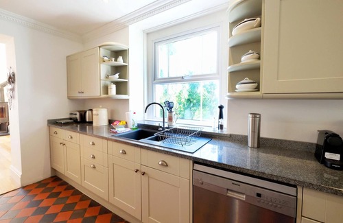 The living room is warm and spacious with two large sofas and a leather armchair. Here will also find a flat screen TV Ideal for keeping the kids entertained. The full, floor to ceiling bay window, lets loads of natural light in and sitting here, you can enjoy views of the garden and the ocean at the same time.