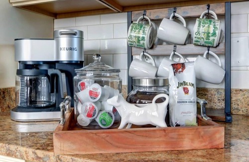 The living area and kitchen flow perfectly together, creating an inviting space perfect for cooking and relaxing after a day of exploring. In the living room, enjoy an oversized sofa and smart TV ready to stream your favorite shows. The kitchen features all custom cabinetry and copper-tone granite countertops. Brand-new stainless-steel appliances and all the essentials provide you with everything you need to cook full meals during your stay.