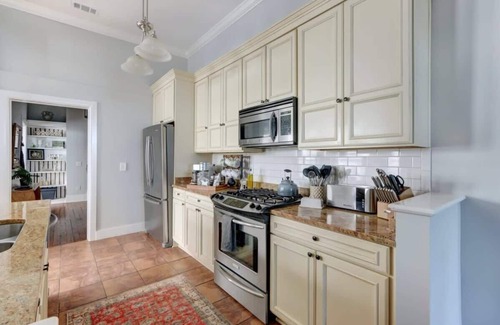 On St. Paddy's Parade Rt! Luxury and history combine to provide an incredible Savannah lodging experience. With two ensuites, this second-floor apartment offers newly renovated spaces that bring all the comfort you expect today while preserving the historical touches of this long-standing piece of Savannah’s colonial past. Steps from The Pirate House (Savannah’s oldest building), minutes to the Riverwalk, and on the original grounds of Trustee Gardens, history surrounds your stay at The Retreat.