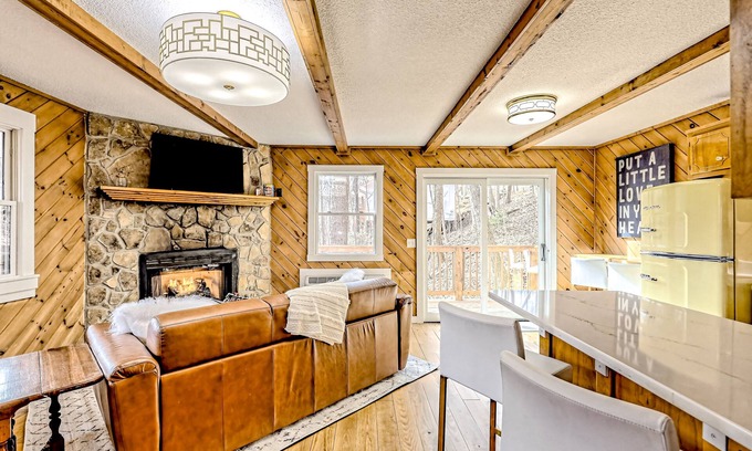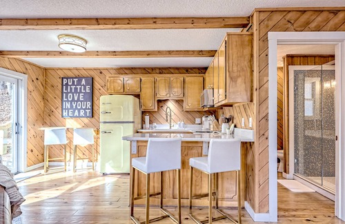 Descend a flight of exterior stairs to enter by way of the deck, a blissfully shady spot with a commanding view of the forest. Inside, the living space is all on one level, offering an open layout, classic wood-paneled walls, and a gas fireplace to warm you on chilly evenings. Enjoy a well-equipped kitchen with a retro-inspired fridge, two breakfast bars, and TVs in both the living room and the bedroom. Air conditioning and complimentary WiFi are provided as well.