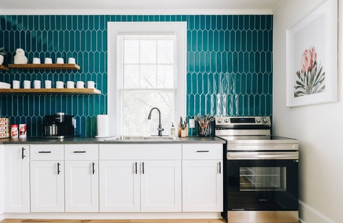 Moving to the Main Home's Top Floor Unit you will step into the most unique and stylish space with its fresh and bright design. The aesthetically beautiful, fully stocked kitchen with its peacock-colored picket tile and bright green SMEG Retro fridge provides a warmth and cheerful atmosphere to the whole group! Snuggle up on the chaise lounge sofa complete with comfy accent pillows to catch up on your favorite shows/movies on the 55" Samsung Smart TV. The Top Floor Unit's full bathroom displays a modern clean vibe and offers a shower/tub combination, large mirror with storage, a multiple drawer vanity for all your toiletries and lots of natural light! Both bedrooms have King-Sized beds with multiple pillows and extra blankets for your individualized comfort, remote controlled fans/lights, Dohm Classic White Noise Machines and blackout curtains. Each room also has a 55" Samsung Smart TV, ample closet space, large mirrors for getting ready and comfy chairs.