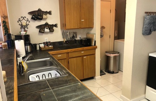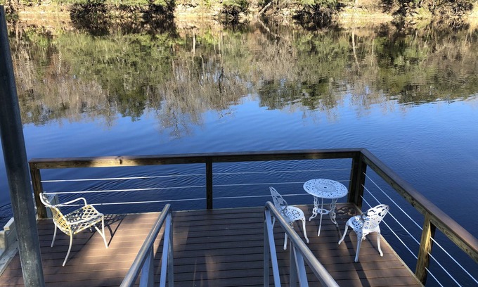 This 2 Bedroom 1 Bath house on stilts is nicely appointed to provide you a restful retreat. The 850 square foot home sits on just shy of an acre of land that opens up to 150 feet of your own private river frontage. Two little known springs directly across the river feed into the Suwannee. Launch kayaks from the private dock and you are a few paddles away. Fully equipped kitchen makes mealtime an easy option, and with two large sliding glass doors, your view of the river goes unimpeded while cooking and dining. One bedroom features a king bed, and the other offers a queen bed as well as twin bunk beds. Satellite internet helps you stay connected, and drives the TV which features apps to deliver whatever content you subscribe to (owners provide Netflix and Disney+). A large porch with rocking chairs and ceiling fans offers a view of the river while enjoying your morning coffee, and/or evening beverage of choice. Downstairs you will find plenty of space for cookouts, relaxing around the fire pit, or resting riverside on the wood deck and private floating dock. String café lights bring the nights to life, extending your outdoor space into the evening.