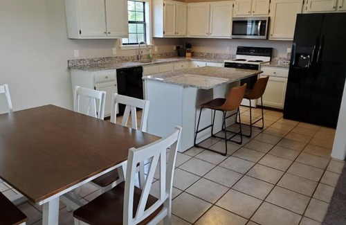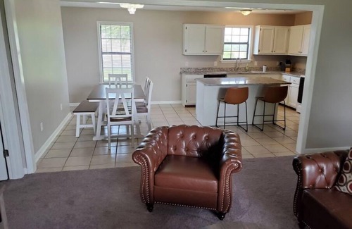 Spacious ranch style home with large eat-in kitchen/island with open concept to the dining area and living room. Large screen, LCD Smart TV in the living room is hung on a pivoting bracket so favorite shows can be viewed from the kitchen while cooking or dining area. Guests are all provided access to complimentary wireless high speed internet along with numerous streaming platforms and premium channels.