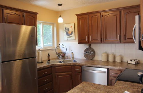 Designed in the Scandinavian spirit of Hygge (or coziness), pronounced hoo-ga, this unique one and 1/2 story has everything needed to be your home away from home. "Nebraska/Omaha" themes throughout, from Nebraska "farmhouse" to College World Series. Includes all of the necessities for traveling light and living away from home: bedding, towels, pots, pans, dishes, pantry staples, paper products, soaps, shampoo/conditioner/body wash, laundry supplies, etc. The kitchen is stocked with waters, a coffee bar (k cups, tea, creamer) and pantry staples for your use!