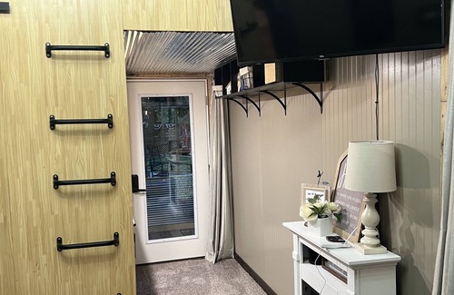 This Army Veteran-owned one-room cabin features a Queen-size bed, a fold-out chair bed, and a cozy loft area for sleeping. Inside, you'll find a smart television, DVD player, free Wi-Fi, and an electric fireplace for those chilly evenings. The kitchenette includes essentials for a comfortable stay, such as a refrigerator, microwave, electric skillet, crock pot, coffee maker, and toaster.