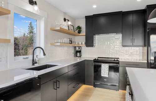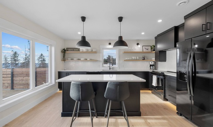 The main level has a fully equipped kitchen open to the living space, with the option to dine inside or out.