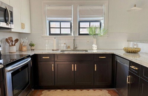 **Kitchen:** Experience a fully stocked kitchen that offers all the comforts of home, conveniently situated at the back of the house near the pool area. The U-shaped layout provides an inviting and efficient cooking space, perfect for entertaining while enjoying an open floor plan. Start your day with a delightful breakfast in the sun by the pool, just steps away from the kitchen.