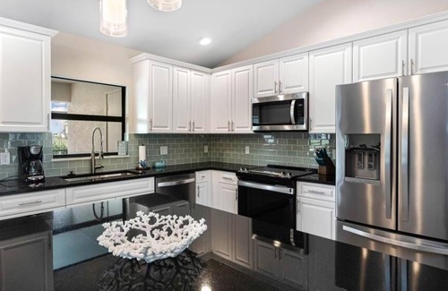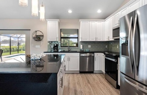 Brand New Home & All Furnishings with Heated Pool- Low Fees! Enjoy a hassle free stay in this brand new home with all new furnishings. Take a dip in the heated pool, which is fully screened, and with the southern exposure you and your guests can soak up the warm Florida sun! The pool temp is kept at a consistent 85 degrees for your enjoyment. Or sip a cocktail and relax on the oversized 28’ long lanai featuring sliding doors which fully pocket for true indoor/outdoor living. Unlike many homes in Cape Coral, there’s still plenty of space to enjoy the outside yard area for games as well. When the sun goes down, turn on the pool light or even the beautiful string lights which surround the entire space! Just inside you’ll find an open concept, fully equipt kitchen & eating area featuring new stainless steel appliances, granite counters, a large family sized kitchen table and counter bar eating space. Vaulted ceilings connect the kitchen/dining area with the living room which also features new furnishings, a 75” smart TV with the ability to stream from your own accounts, as well as a queen pull-out sofa. High speed internet for your devices! The primary bedroom offers a king bed, plenty of storage, a 58” smart TV, and a luxurious double shower head walk-through style shower & soaking tub and dual vanities. This bedroom also offers sliding doors to the lanai and a desk if you must mix work and pleasure! Two of the other bedrooms offer queen beds, and one offers and full bed plus a roll out cot for additional sleeping space. Additionally, there are two more smart TVs which are 58” and 43”. The main bath offer a granite vanity, tiled tub/shower, and a private door for the toilet room. This bathroom leads directly out to the pool/lanai for convenience. This home has been thoughtfully planned for families wishing to spend time in beautiful Southwest Florida. It has been tastefully decorated, and purposefully equipt for our short or long term guests. ☀️🌴