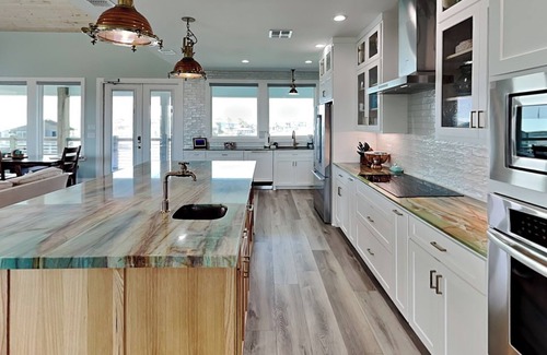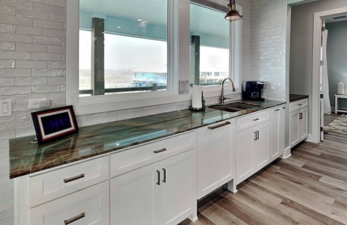 Inside, this retreat comfortably sleeps up to 12 guests across four beautifully appointed bedrooms, each offering its own unique view of the water. The open-concept living area is flooded with natural light, creating a seamless blend between indoor and outdoor coastal living. The quartzite countertops in the fully equipped kitchen add a touch of modern sophistication, while state-of-the-art appliances and ample counter space make meal prep effortless after a day of adventure.
