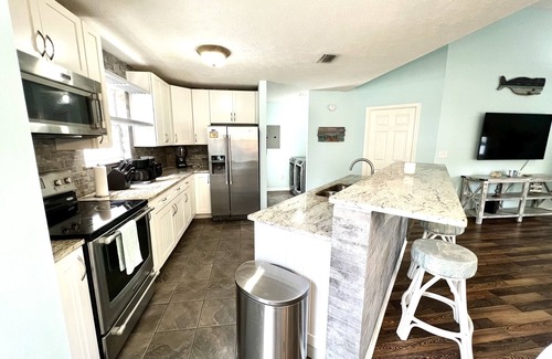 2 min ride to the beach on our 4 seater, street legal golf cart available at $50 per day to guests age 25+. Clean and freshly painted inside and out 1,112 square foot space with hi-speed WIFI, smart TVs in each room, a desk/vanity, fully equipped kitchen with modern appliances, washer / dryer, hair dryer, and iron / ironing board, BBQ pit with flat top grill, outdoor shower, and seating areas in front and back.