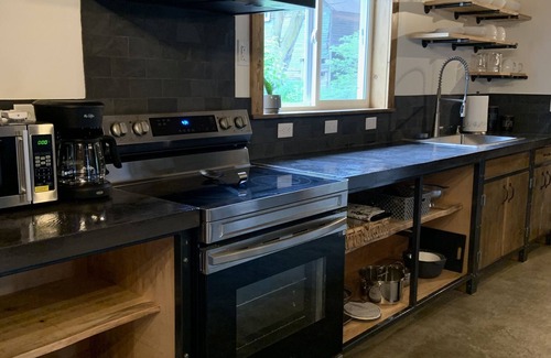 The Sanctuary is located in a wonderful blend of farm and nature for a peaceful getaway. It was designed and handcrafted by your hosts to reflect the peacefulness of a simple farm life while giving you the amenities of modern life. Inside: Designed in a studio style it features a soaking tub with hand shower, a full kitchen, a custom queen bed with an Organic mattress and a comfy couch to watch tv as you enjoy the comfort of in-floor heating or A/c.