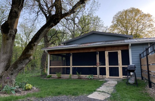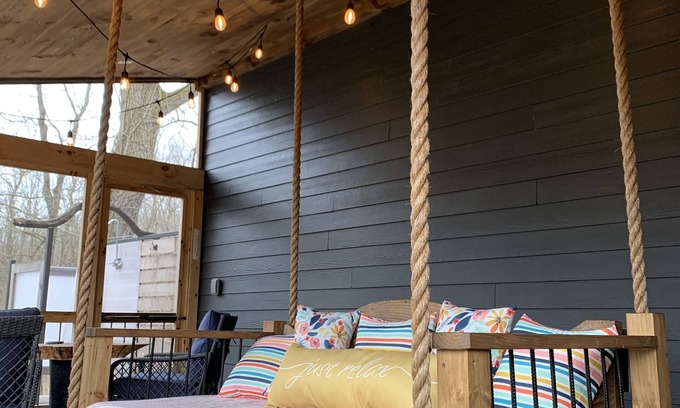 Outside: Relax in the screened porch surrounded by farm and nature. Lounge in the chairs or the oversized swing. Enjoy a meal on the porch or sit around the fire pit to watch the flames dance. Shower under the stars in the outdoor shower.
