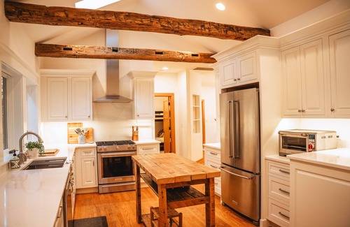 Inside, the fully renovated two-story farmhouse spans about 2,300 square feet and has been thoughtfully updated with hand-hewn beams harvested from the property, quartz countertops, and modern appliances. The open kitchen is fully stocked for creating memorable meals to share around the custom ten-foot farmhouse table that anchors the dining room. Gather in the family room beside the stone fireplace, stream your favorite shows on the Smart TV, or settle into the cozy library with its curated collection of books on local heritage, nature, poetry, and reflection.