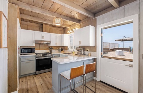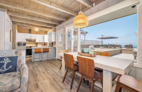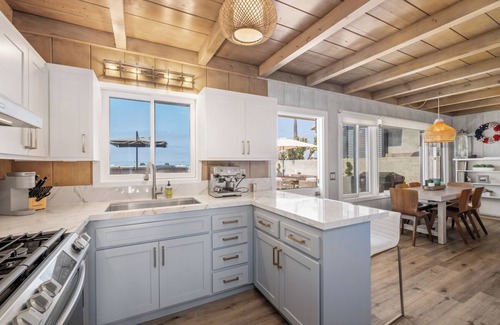 Update: As of Jan 13, construction is in process at a neighboring home. Construction activity is expected from 7:30am-6pm Monday through Saturday. This is a single-level original 1950s California beach bungalow. The single-family residence features 3 bedrooms, 2.5 baths, a den with pullout couch, an office, a living room with a gas fireplace, and a full kitchen with ocean views. The brand-new deck offers room to spread out, sunbathe or enjoy time with family and friends, with a lower patio area offering room for play, and an outdoor dining area with a Blackstone Grill. Umbrellas, beach chairs, and beach toys are at your disposal.