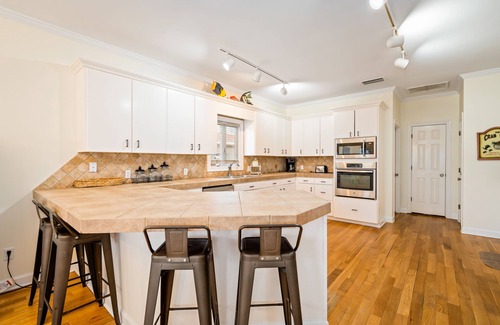 The open floor plan is perfect for entertaining guests, with a large living room with a flat-screen TV with Dish satellite and a half bath nearby. The formal dining room can accommodate six people, while the tiled kitchen bar can seat four. The kitchen has abundant cabinet space, extra dishes, glassware, silverware, crockpot, two microwaves, 15-cup coffee maker, highchair, booster seat and excellent supply of cookware. Stainless appliances are included, and an additional full-size refrigerator is in the laundry room adjacent to the kitchen.