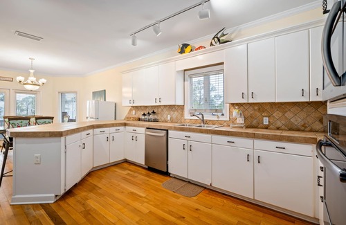 Beach access is almost directly across the street from the home, with a boardwalk leading straight to the waves. You can enjoy beautiful views no matter where you look, and the East End location puts you close to the Estuarium, Audubon Bird Sanctuary, and Ferry Landing.