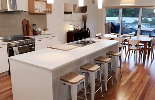 The dining area is a part of the large living area. Share a meal on our 8-seater