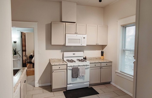 This peaceful retreat offers a perfect combination of comfort & convenience. Enjoy in 1,200 sqft of cozy living space, with original hardwood floors throughout. Relax in the living area, work from ease in the separate office, and enjoy sweet dreams in the cozy bedrooms with queen & king sized beds. The bathroom is modern, and in-unit laundry adds convenience. Stay connected with high-speed Wi-Fi and have easy access to the city's attractions. Plus, convenient off-street parking is available!